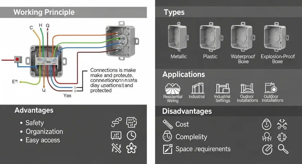 In this article, you will learn everything about junction boxes, including their definition, junction box working principle, types, components, applications, advantages and disadvantages, selection guide, and common problems. This guide is written in simple language so that beginners, students, and technicians can understand it easily while still gaining professional knowledge.